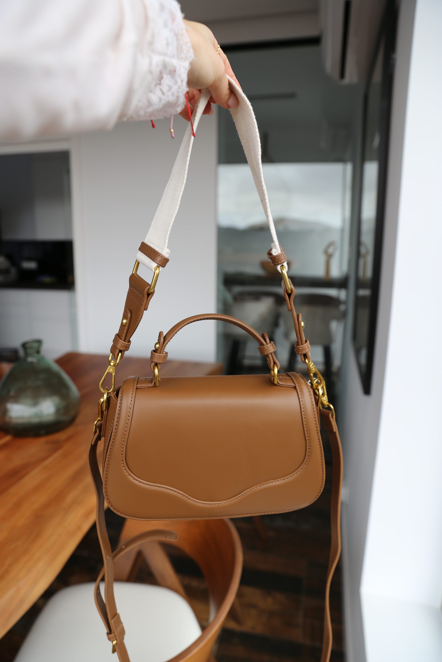 Bolso en tono camel que combina un diseño minimalista con la máxima funcionalidad. Incluye un asa de mano rígida y una correa intercambiable de tejido para un look más casual. El básico imprescindible que eleva cualquier outfit.