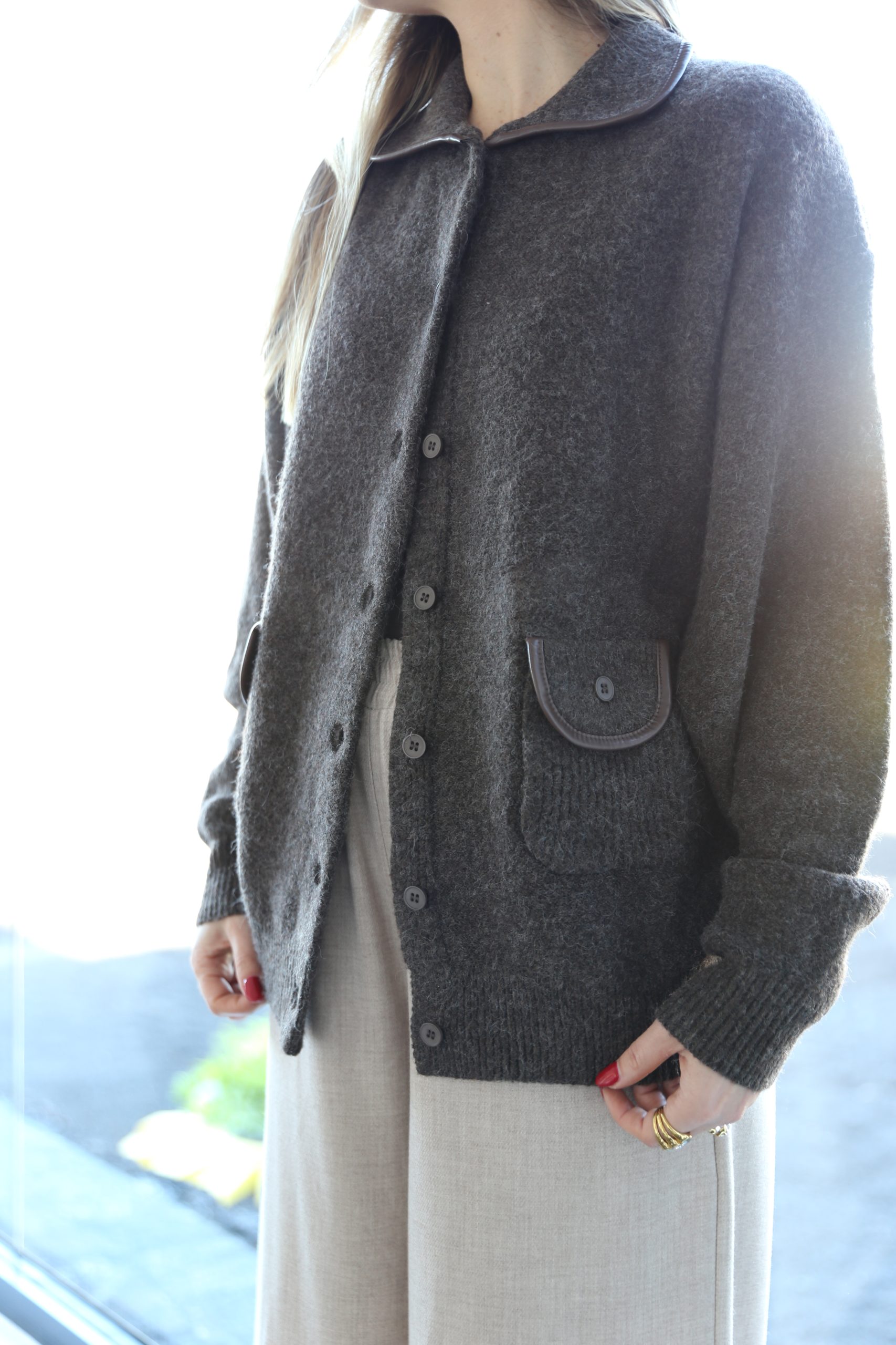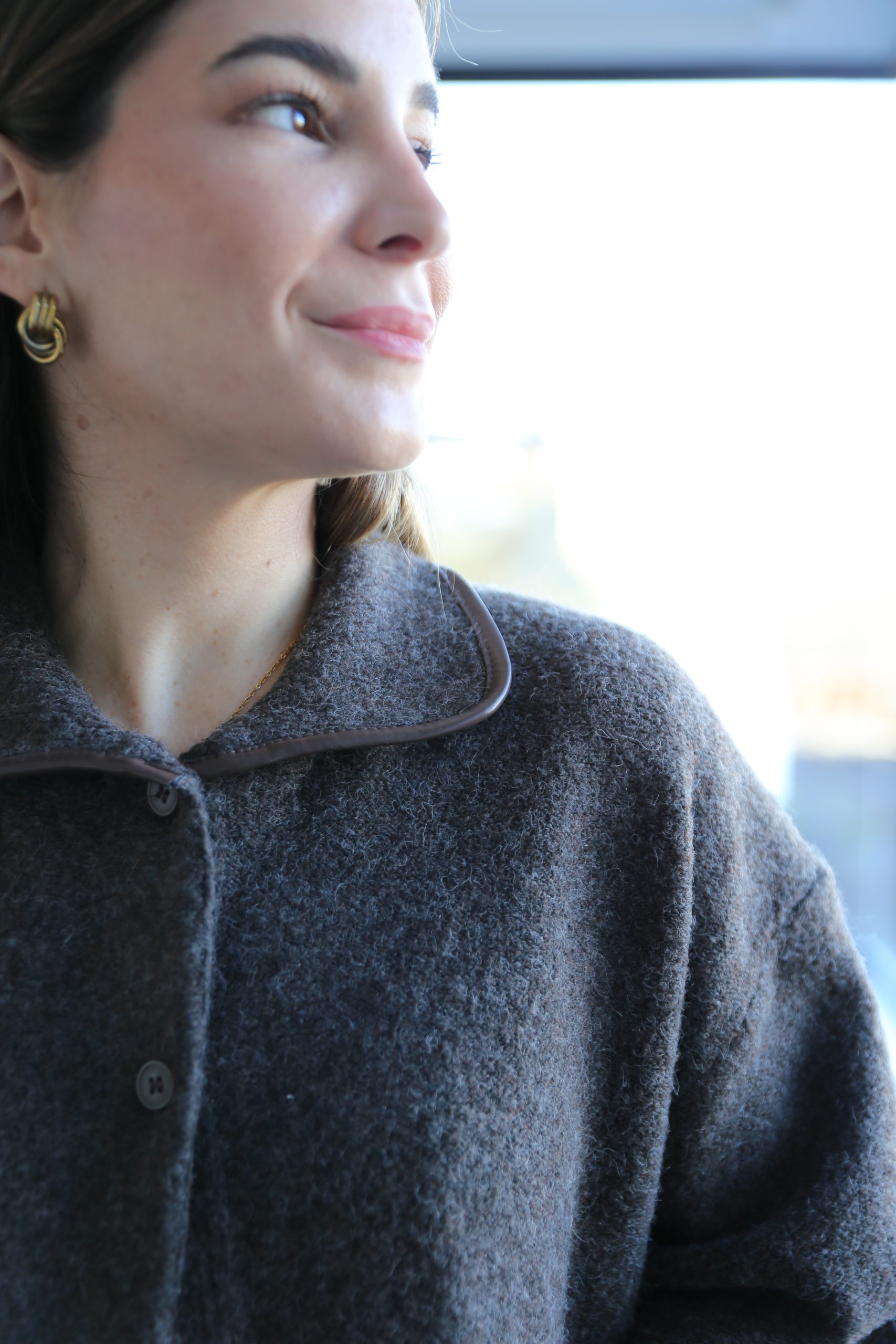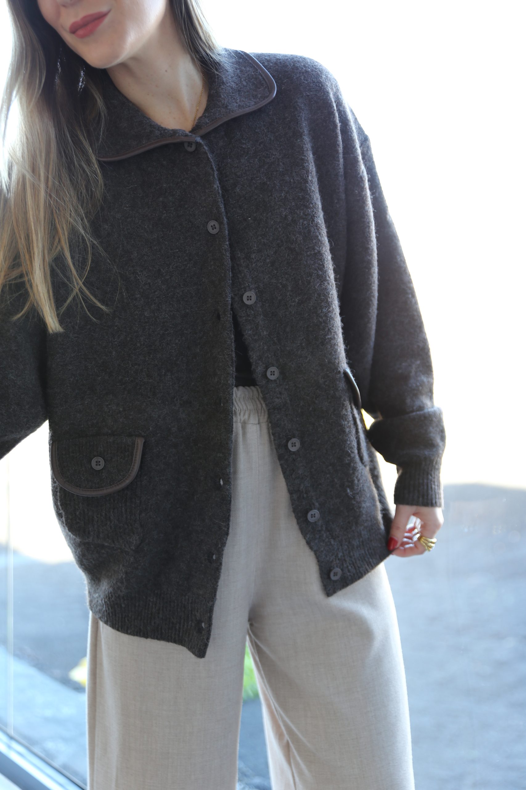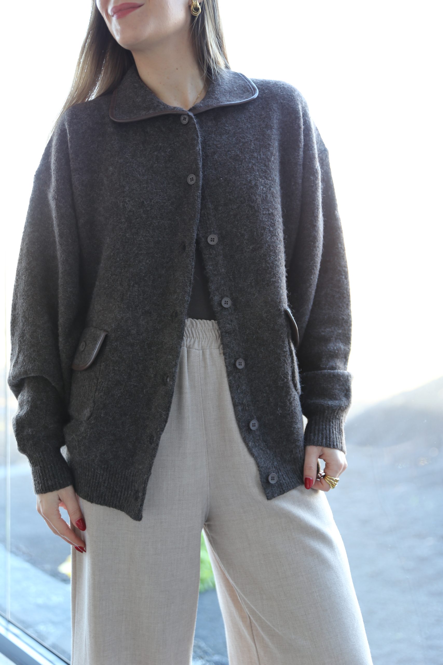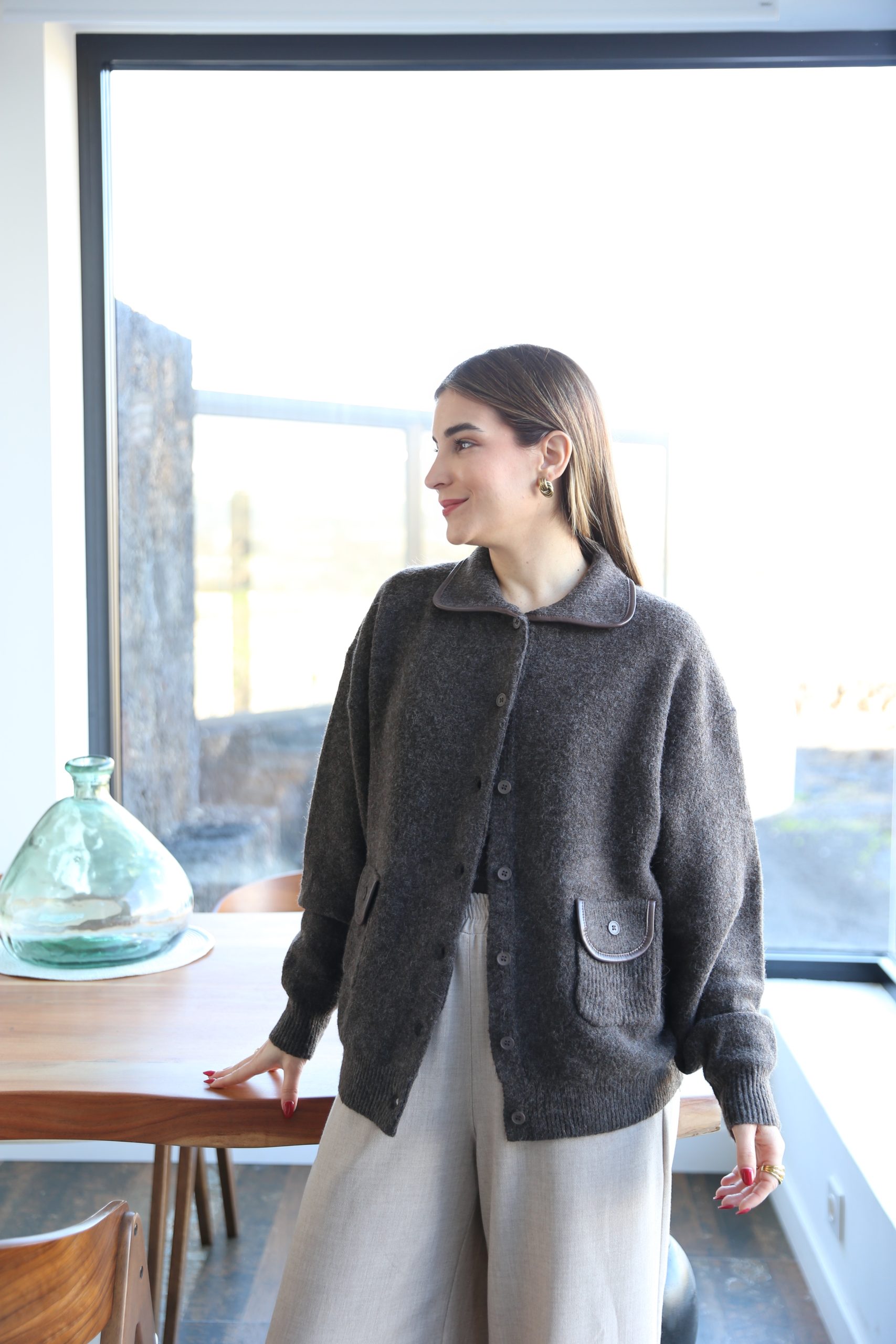 Chaqueta de punto en color marrón chocolate con diseño estructurado que destaca por el delicado ribete marrón en contraste que recorre el cuello y los bolsillos, elevando cualquier conjunto básico.