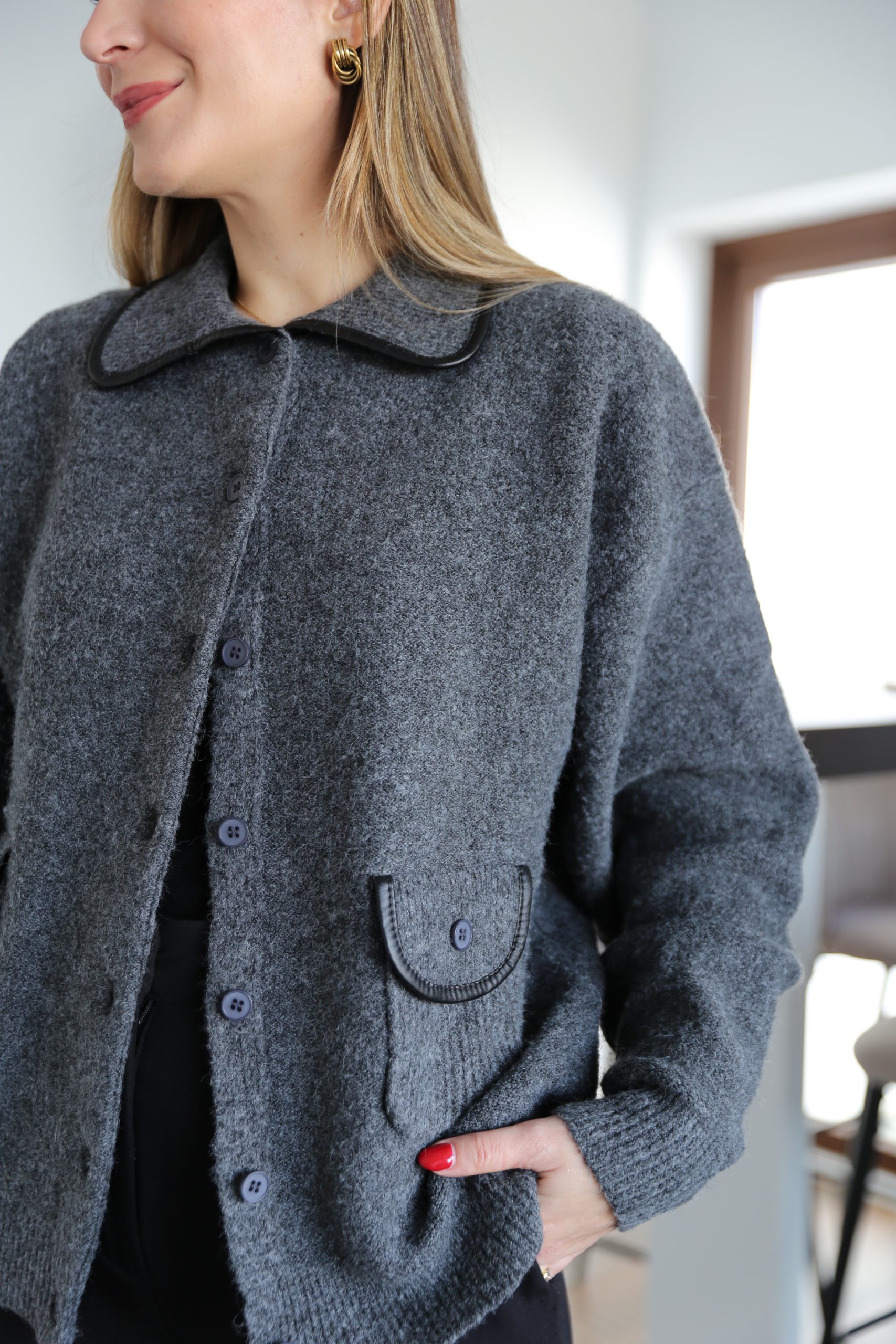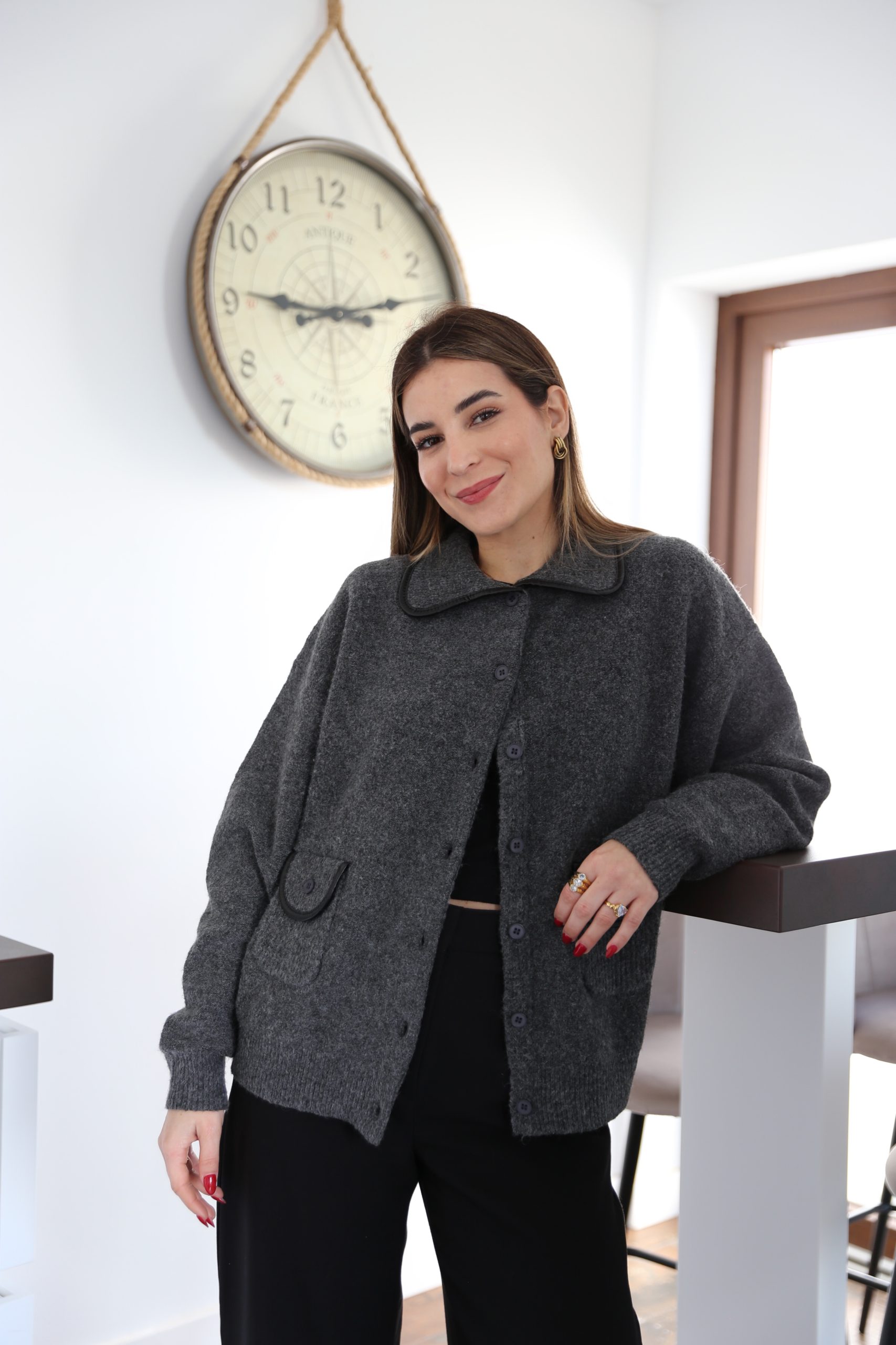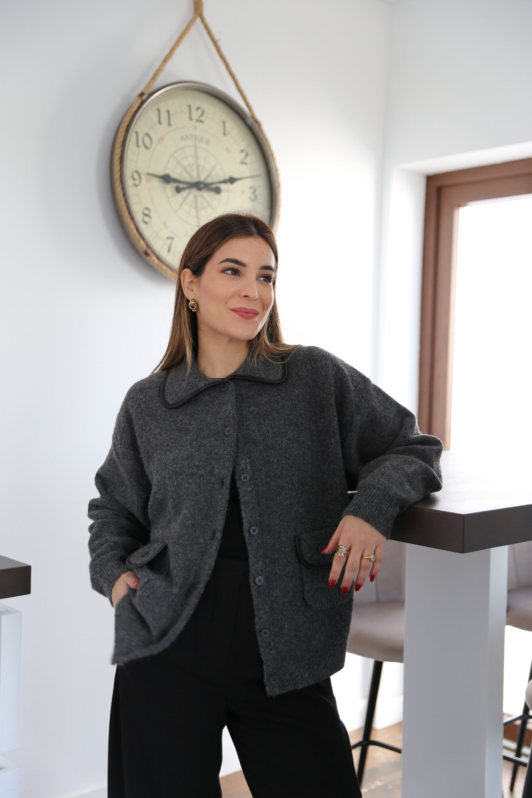 Chaqueta de punto en color gris con diseño estructurado que destaca por el delicado ribete negro en contraste que recorre el cuello y los bolsillos, elevando cualquier conjunto básico.