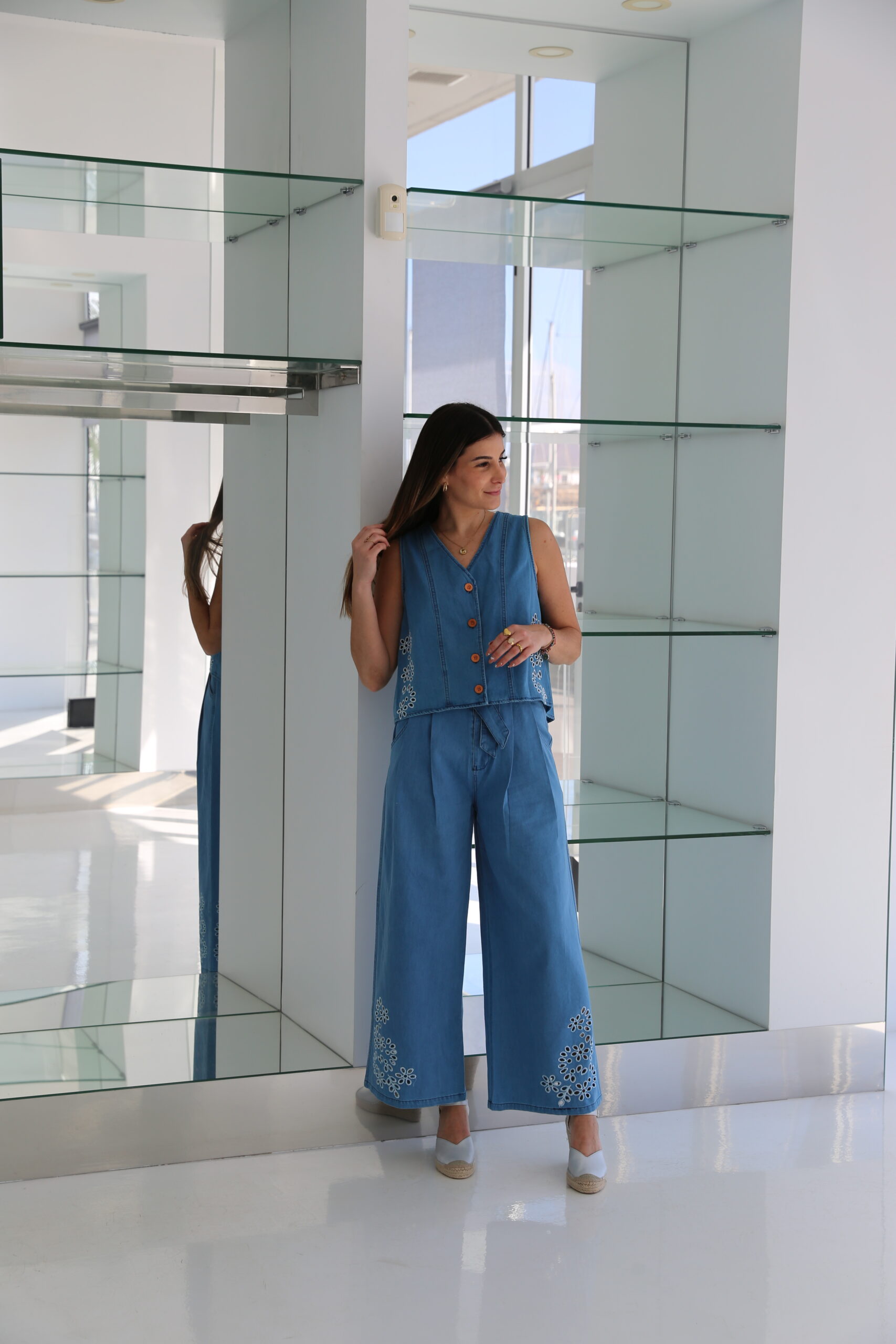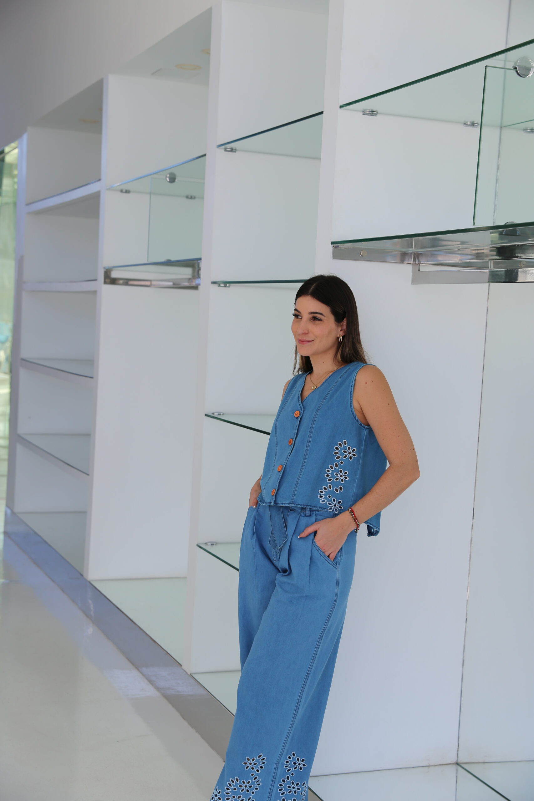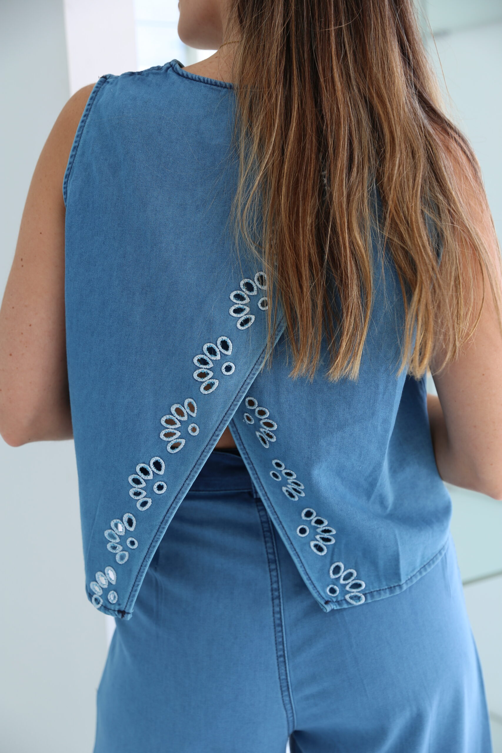 Conjunto denim de chaleco abotonado con la parte trasera cruzada y pantalón con pinzas y bolsillos con cremallera y botón. Lleva lazada y detalle de bordados.