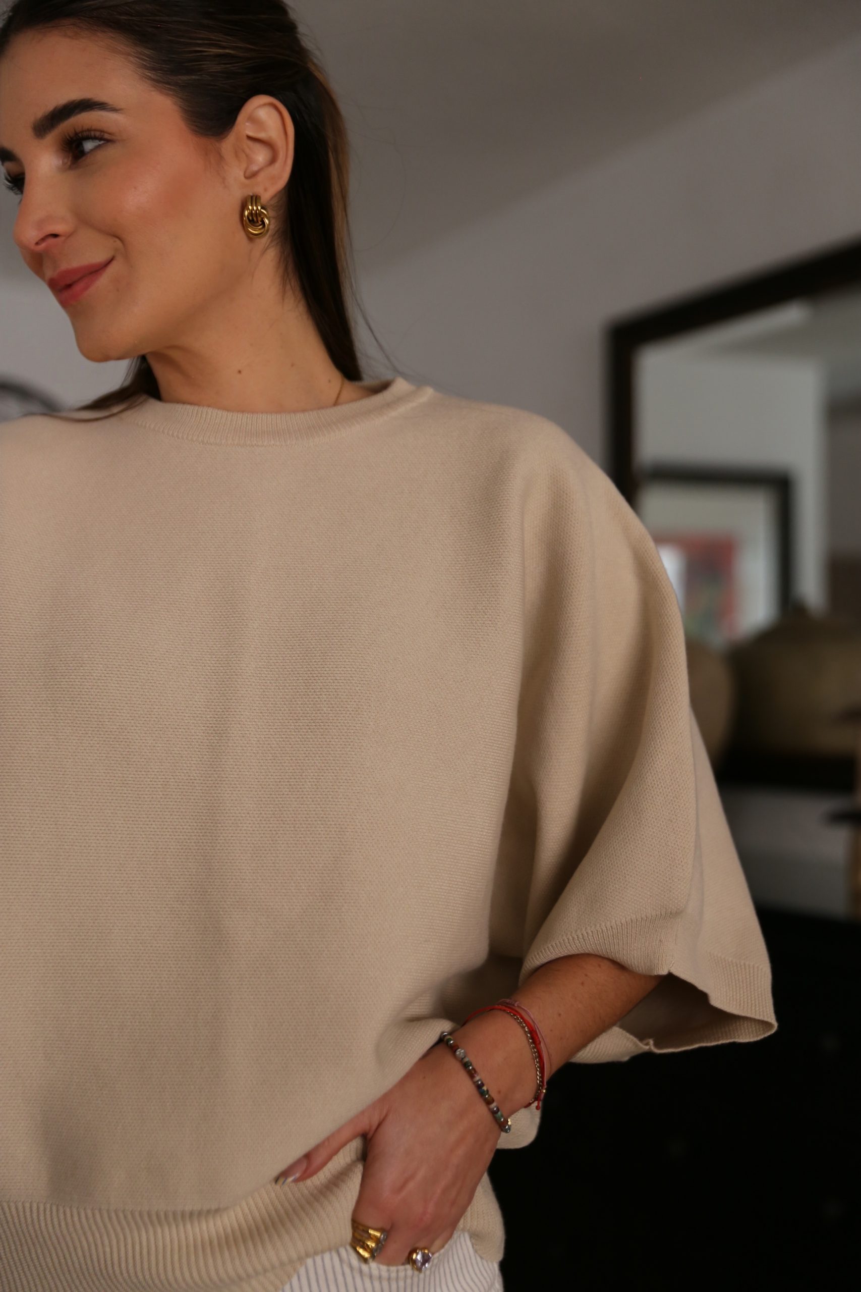 Jersey de punto fino con corte ancho y relajado. Mangas estilo murciélago y acabado elástico en el bajo. Una prenda básica y cómoda para el día a día.