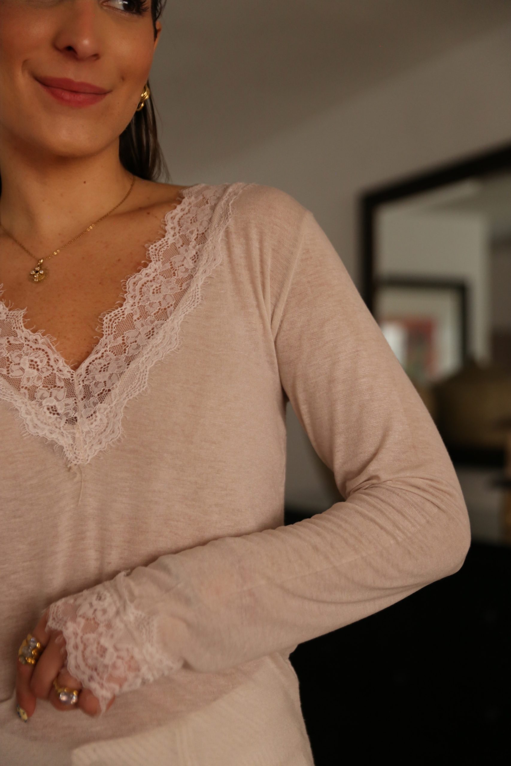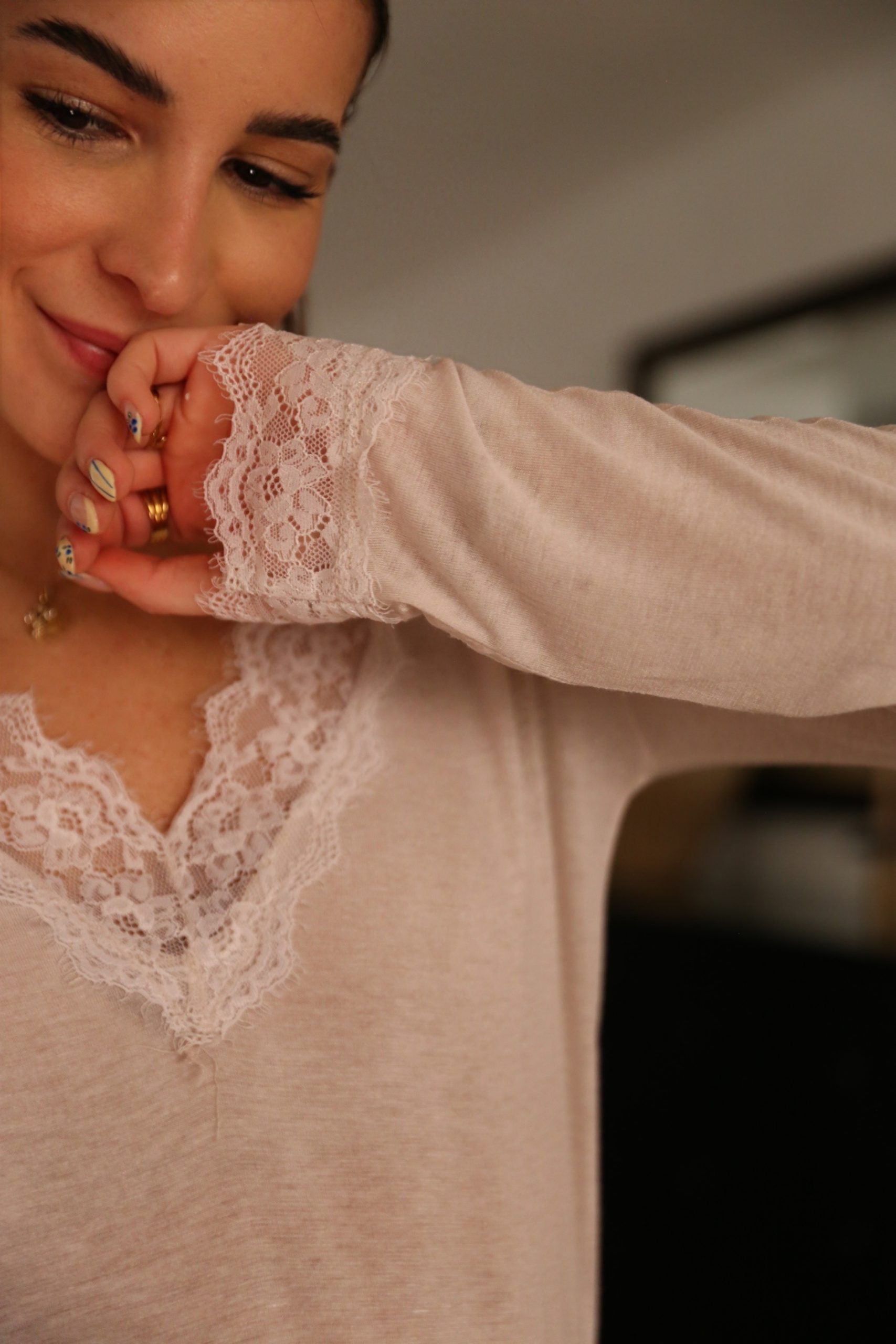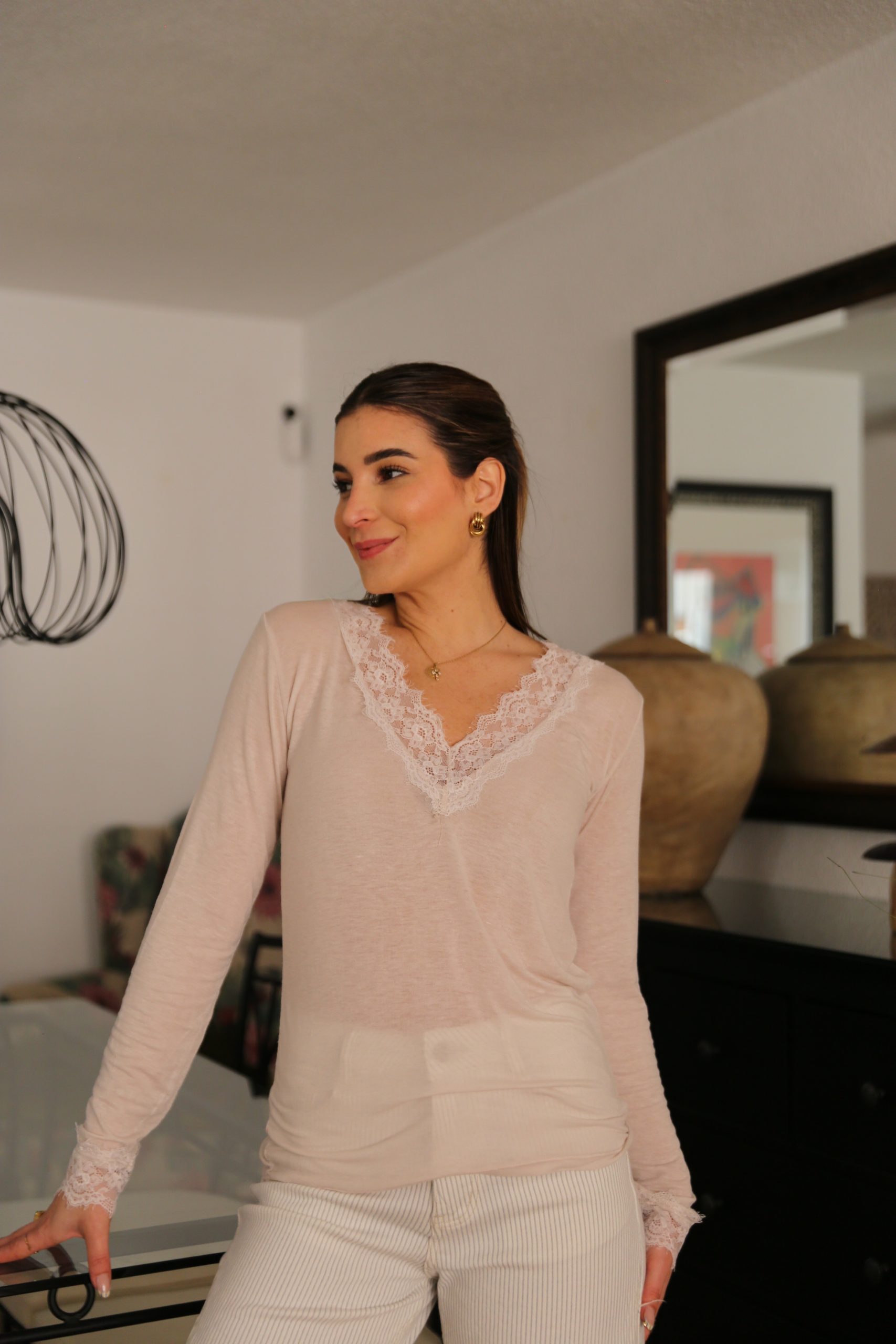 Camiseta de manga larga. Diseñada con un delicado escote en V ribeteado en encaje floral, esta pieza es el equilibrio perfecto entre lo casual y lo femenino. Su tejido ligero y entallado la convierte en la opción ideal tanto para llevar sola como para crear capas bajo una americana o un cárdigan.