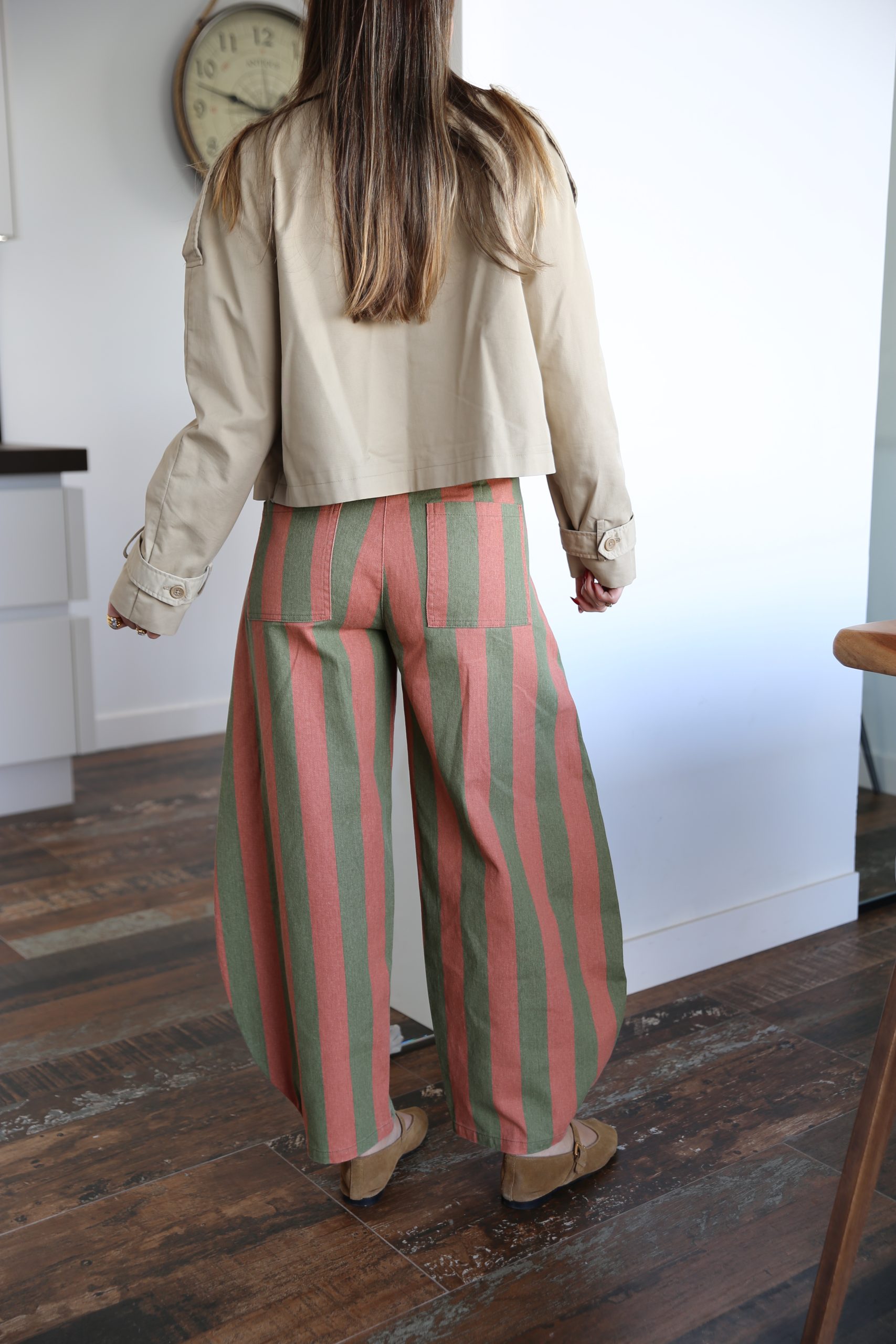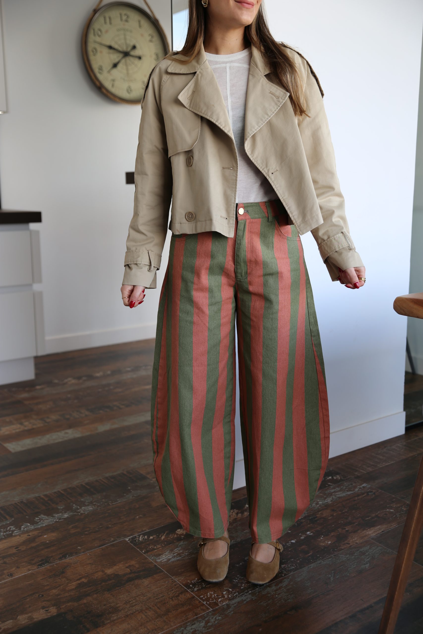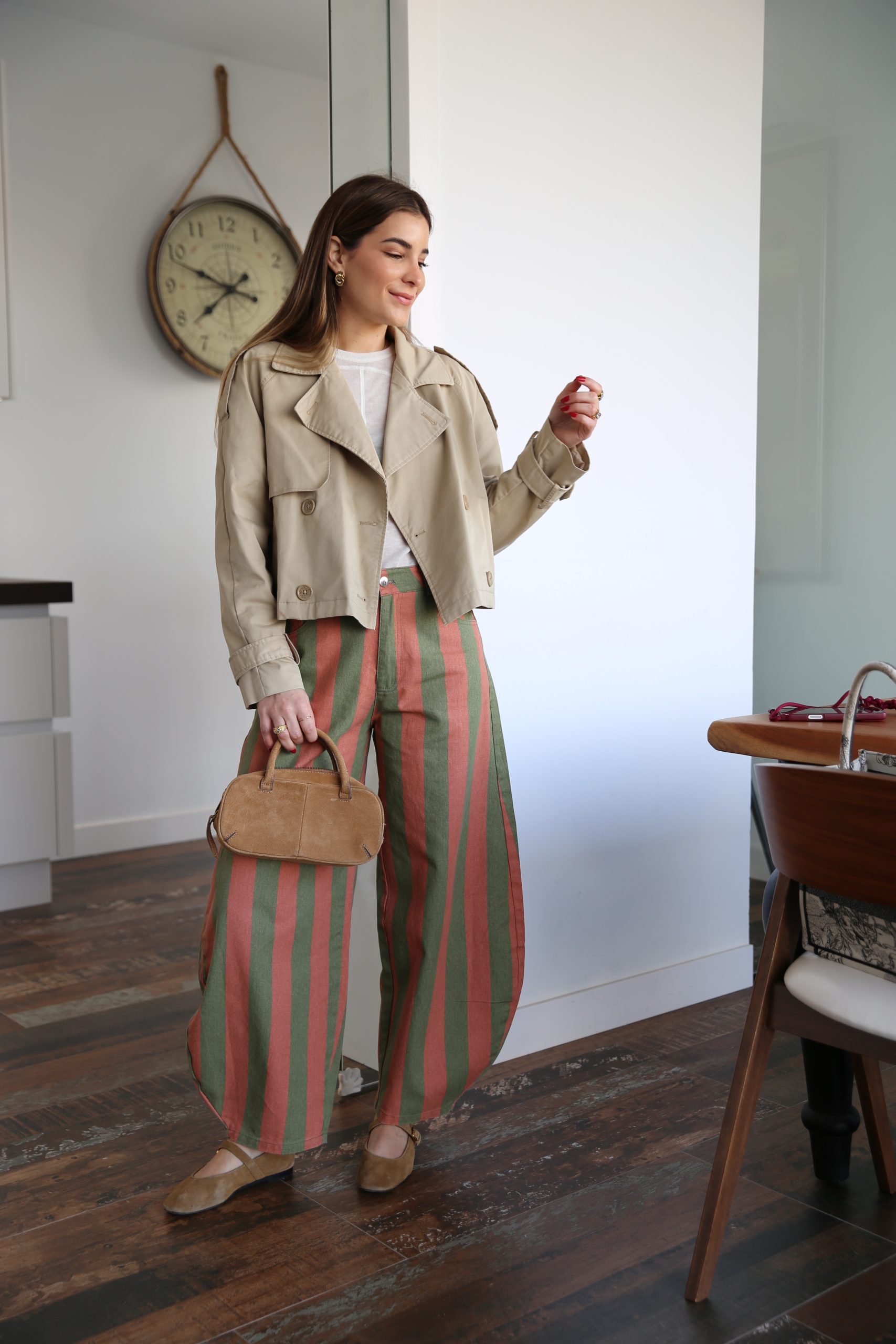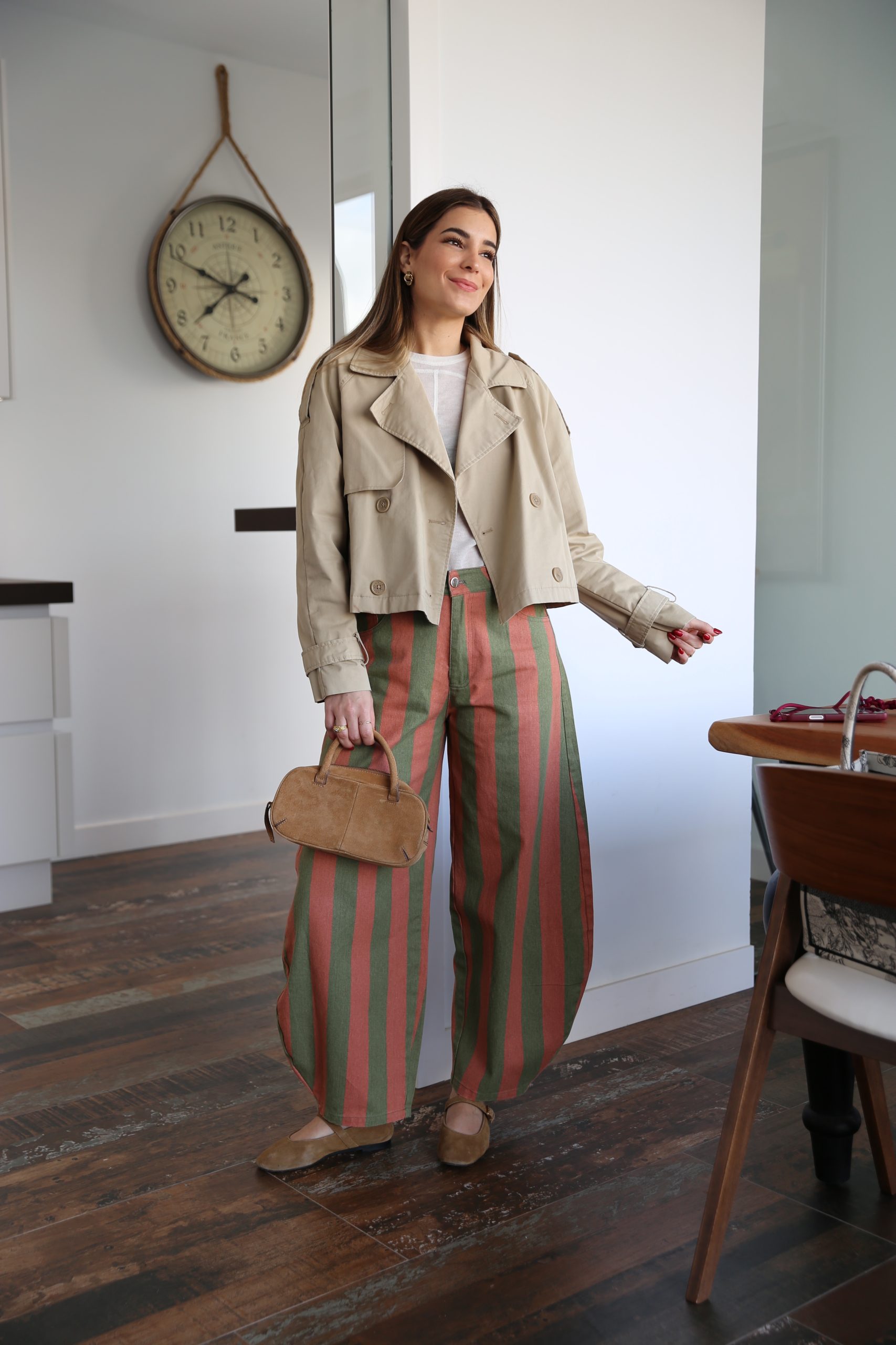• El Estampado: Rayas verticales en contraste verde musgo y terracota, que alargan la silueta visualmente.