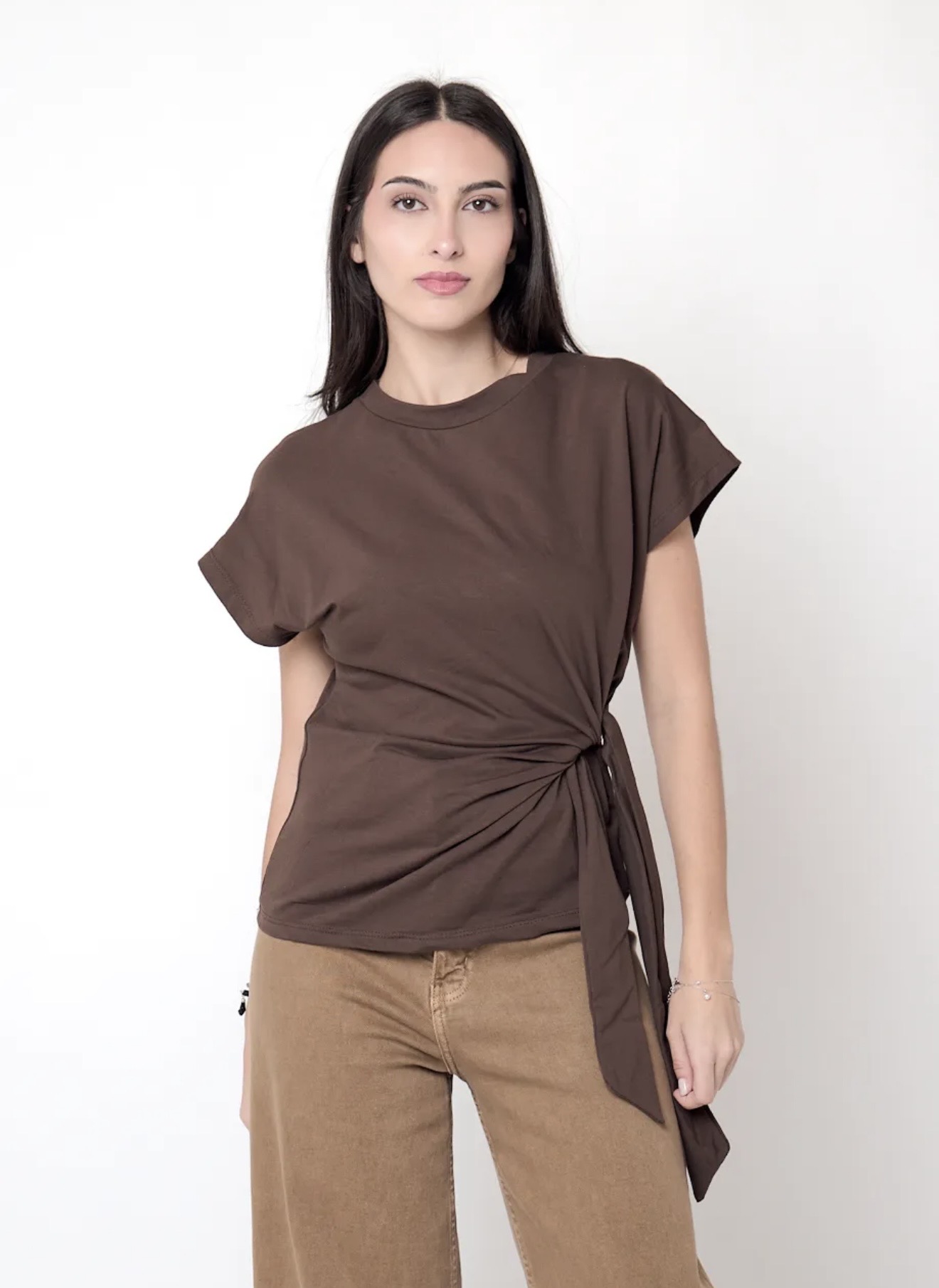 Camiseta de cuello redondo con nudo lateral ajustable. El detalle del drapeado no solo añade textura visual, sino que permite entallar la prenda a tu medida, realzando la silueta de forma natural.
