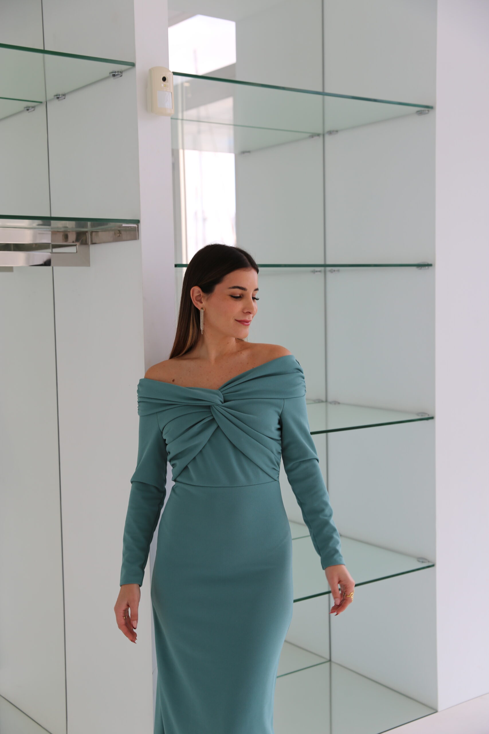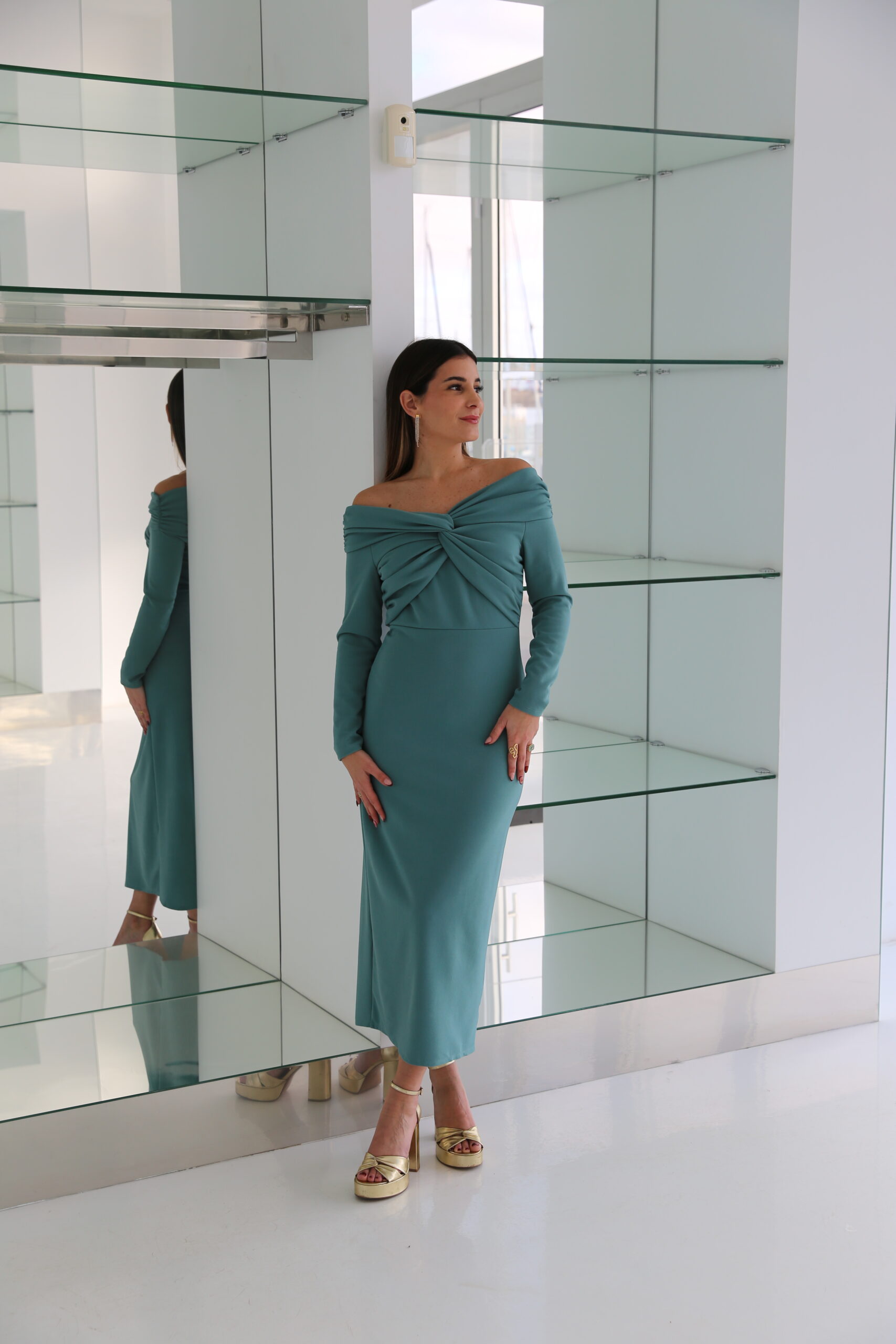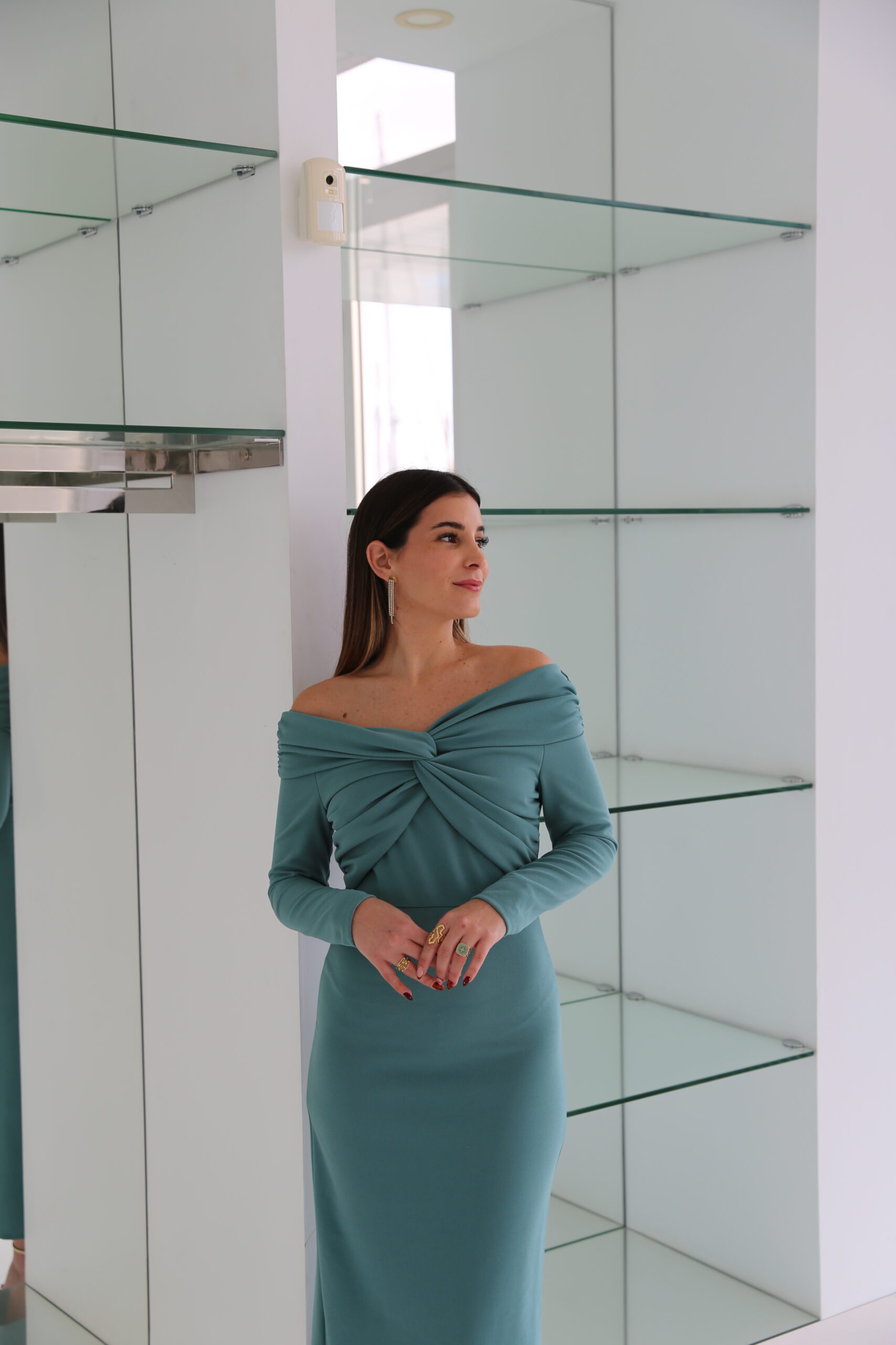 Elegancia y estilo para tus celebraciones con nuestro vestido Yaiza en color Aguamarina.