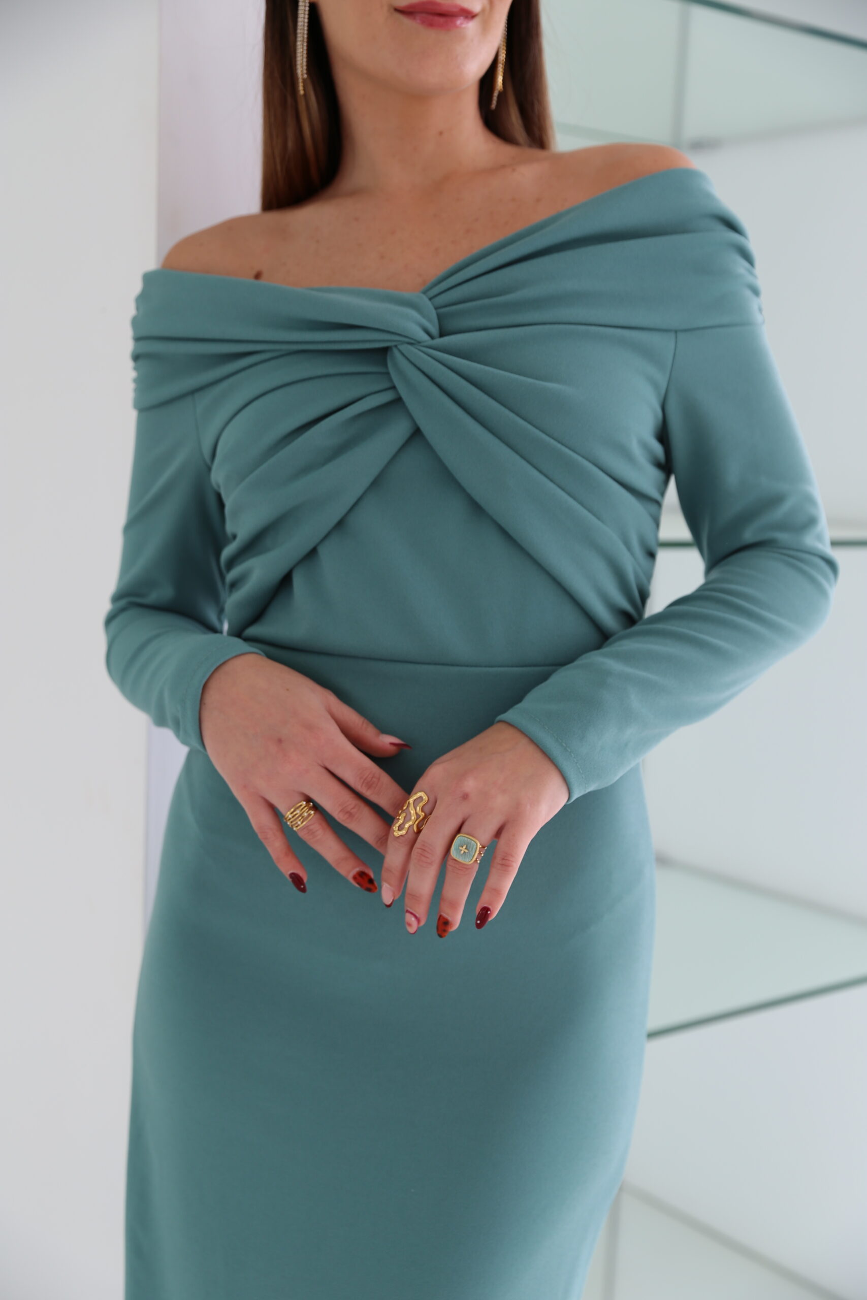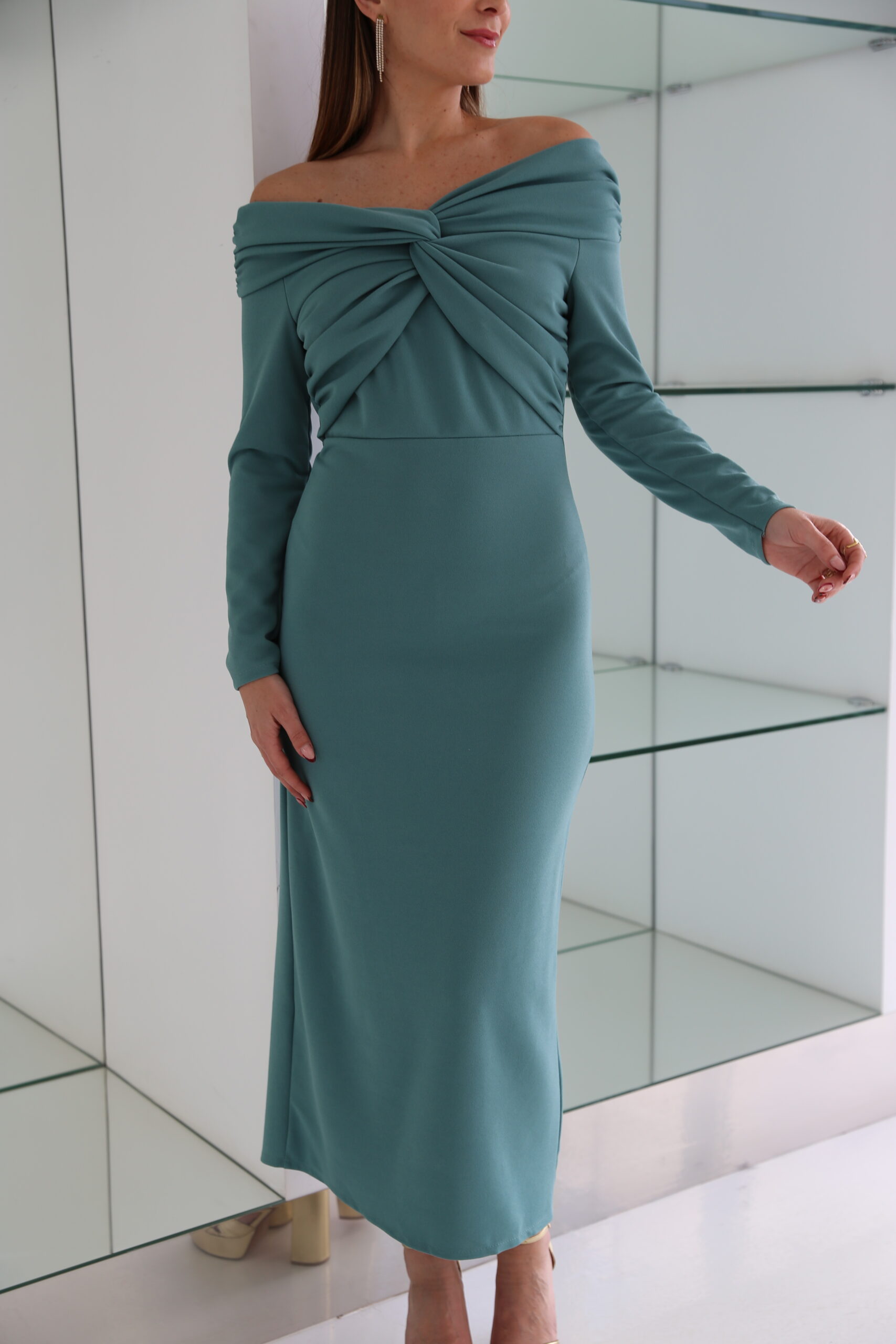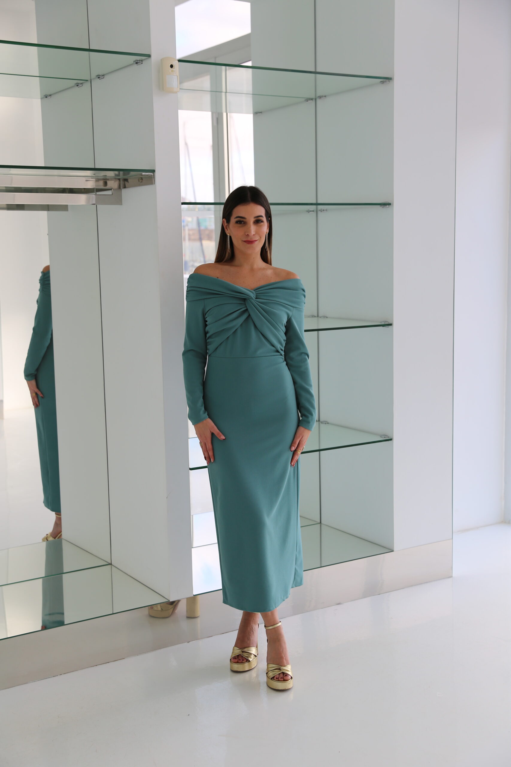 Diseñado con un escote barco y un encantador cruce en el pecho, este vestido realza tu silueta de manera sutil y elegante. La raja trasera proporciona un movimiento fluido, haciendo que este vestido sea perfecto para bodas y eventos de día.